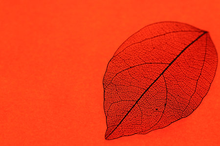 Beautiful skeleton leaf on red background, macro view. Space for text