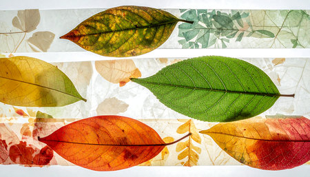 Colorful autumn leaves arranged on a white background creating a beautiful display of fall colors, showcasing the transition of seasons from summer to winter