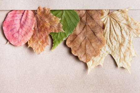 Dried leaf border in soft pastel shades and a variety of shapes on textured paper with copyspace