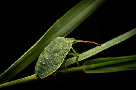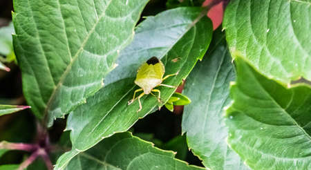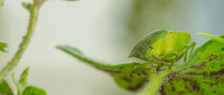 Southern green stink bug, nezara viridula sit on plant in forest, macro toned photo