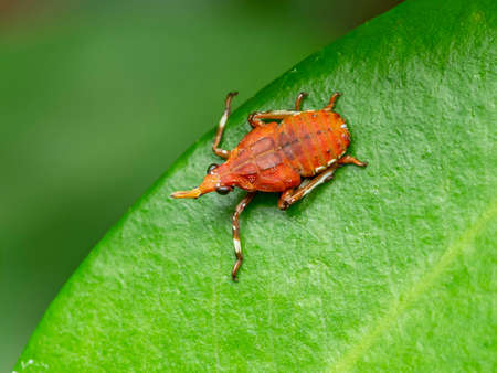 a young brown bedbug sorrel edge (Coreus marginatus) sits on a green leaf