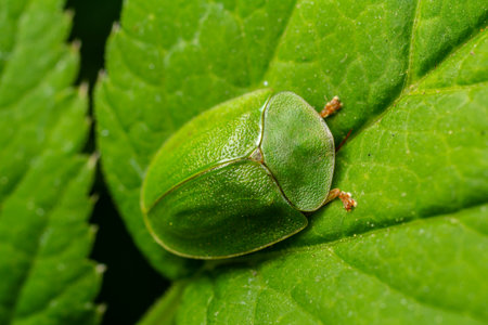side view of red tortoise beetle on green leaf