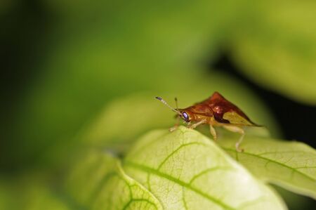 Red bug with pattern on its back stay on the leaf