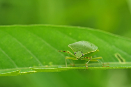 Green stink bug is climbing on the tree leaf