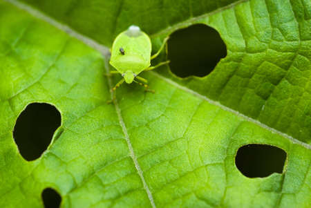 green bug on green leaf in the wild nature or in the garden
