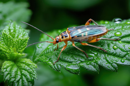 An exquisite close-up image of a colorful insect perched on a dewy green leaf, showcasing fine details and vibrant colors that highlight the beauty of nature.