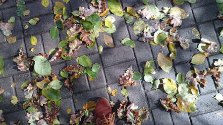 Autumn leaves on the pavement in the park.