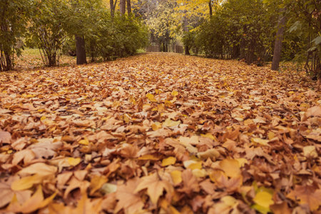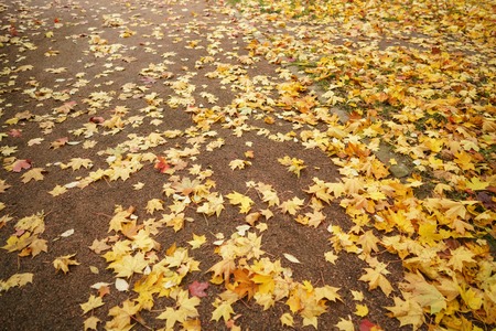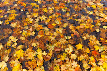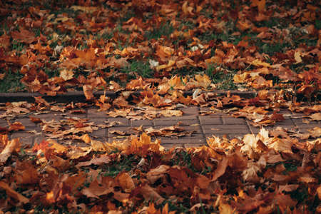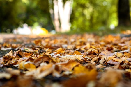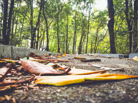 beautiful natural foliage that has changed color in the autumn season, leaves fall on the road