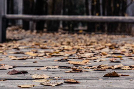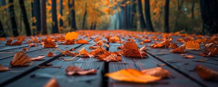 Autumn leaves on a wooden path in a forest, tranquil nature scene. Seasonal autumn concept