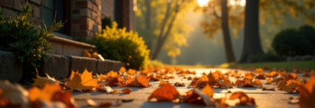 Orange maple leaves blanketing a paved path at sunset, creating a warm and inviting autumn scene near a cozy house, offering ample copy space for text or design
