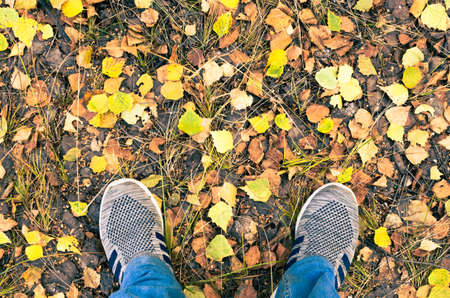 The legs of a man on a background of yellow birch leaves