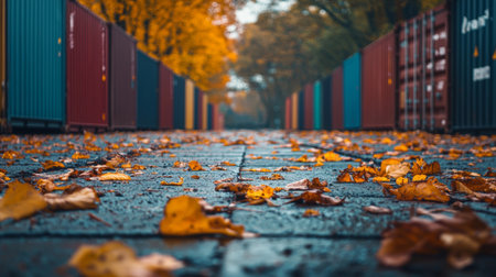 Autumn leaves are scattered on a wet path between colorful shipping containers. Represents fall, shipping, and transportation.
