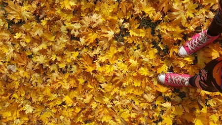 A high angle view of legs standing on a ground covered with yellow leaves during autumn