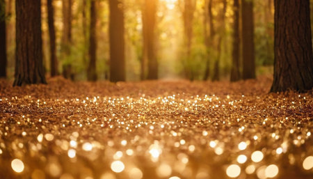 Golden glittering bokeh in the forest. Christmas background.