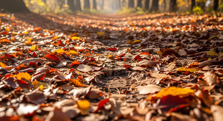 A beautiful autumn scene with a path covered in fallen leaves in shades of brown, orange, and gold, under a clear sky
