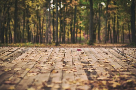 Wooden floor terrace over autumn forest background