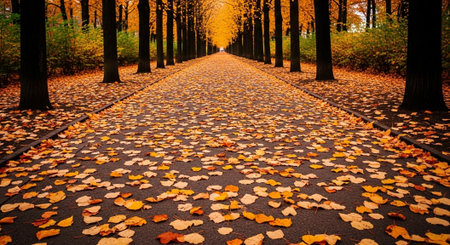 A serene path covered with a blanket of fallen golden leaves invites leisurely strolls in a peaceful park as autumn's beauty unfolds amidst the trees.
