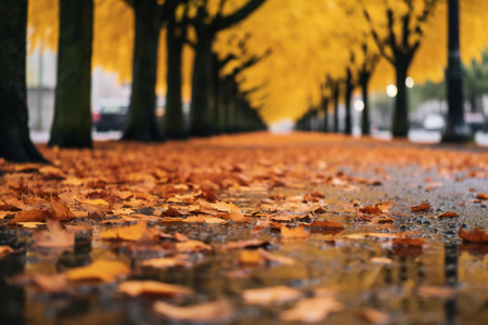 Bright yellow and orange leaves blanket a wet surface after rainfall, creating a scenic autumn view in a park.