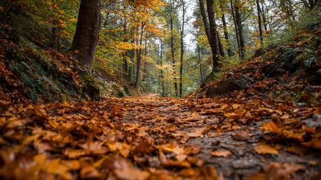 Vibrant autumn leaves create a colorful path through a serene forest