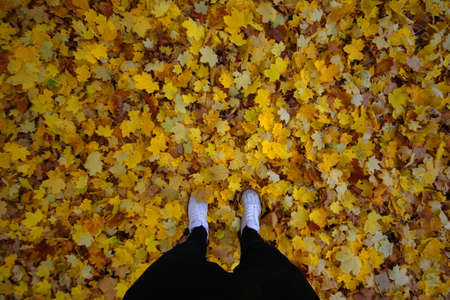 Legs in sneakers on the background of Maple yellow leaves