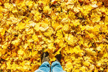 Feet in boots on yellow fallen maple leaves. Autumn walk concept.