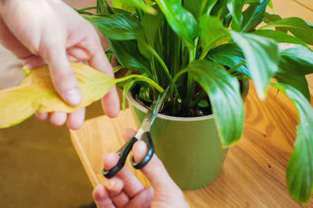 Close-up of hands using small metal scissors to carefully trim a yellowing leaf from a healthy green potted plant. The image illustrates plant care, maintenance, and the hobby of indoor gardening.