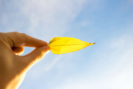 Hand holding fading yellow leaf on sky background. Autumn time season composition.