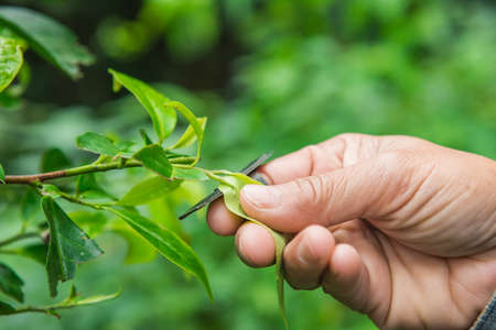 Close up hand to harvesting tea leaf in the forest of Northern, Thailand. Selective Focus.