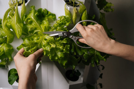 Gardener female using scissors, harvesting fresh lettuce leaves from vertical hydroponic farming system, showcasing sustainable agriculture and modern farming techniques. Concept of home gardening.