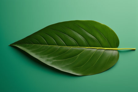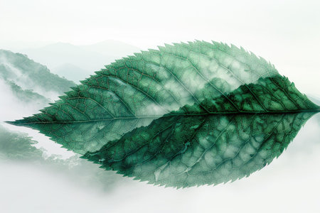 A prominent leaf with intricate details sits on a textured green backdrop, creating a serene atmosphere ideal for organic and sustainable themes.
