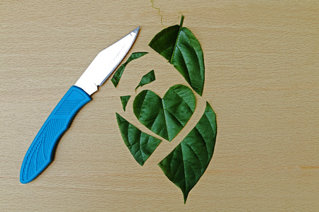 leaf cut in shape heart by shiny knife on wooden background