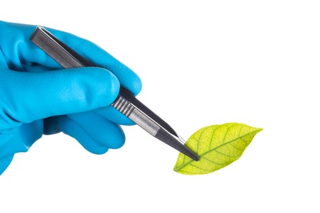 scientist hand in blue glove holding green leaf , biotechnology concept