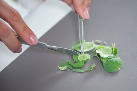 outdoor ingredients in the garden cut ingredients for drugs without destroying the plant. cutting a large sheet of plant with metal scissors