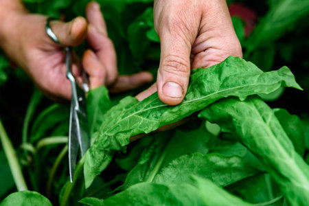 A woman picking fresh green sorrel growing in a garden using scissors.