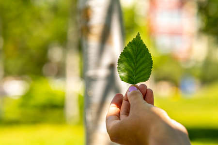 Green birch leaf in female hands on a blurred green background