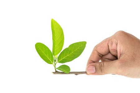 Close up hand holding tree branch with green leaf isolated on white background