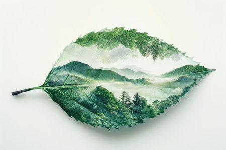 leaf double exposure with beautiful nature background showing concept of sustainability and environmental conservation. aigx04