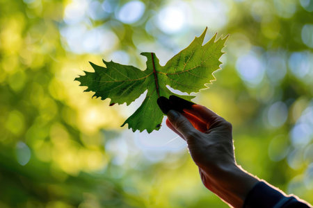 Close up woman showing green leaf covered with epoxide resin concept photo. First view person photography with blurry background. High quality picture for wallpaper, travel blog, magazine, article