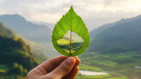 A captivating image of a hand holding a leaf, displaying a breathtaking view of mountains and landscapes through a cut-out. Perfect for nature-themed content.