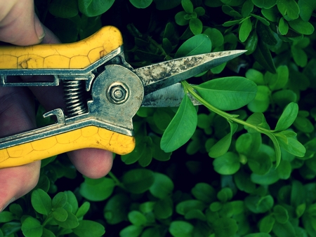 Old hand of artistic gardener trimming bush branch. Cut of bended twig with long spiky pincers