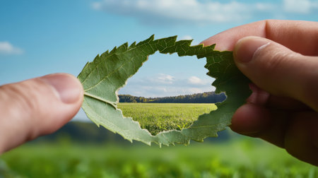 Leaf cut-out revealing serene green field, hand in foreground for scale