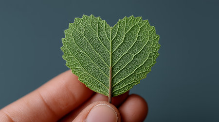Human hand holding a green leaf in the shape of a heart.