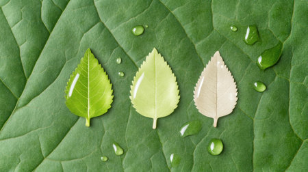 Assorted green and yellow leaves with water droplets scattered on a textured surface