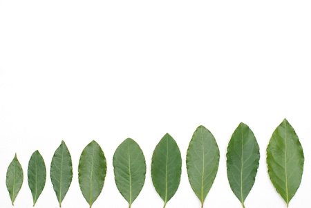 Row of Bay laurel leaves on a white background