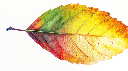 An isolated leaf displays a color gradient, transitioning from green to yellow, against a plain white backdrop. The composition is a detailed close-up, highlighting the leaf's texture and structure. This image could be used for educational materials, design projects, or general illustrations. The lighting appears soft and diffused.