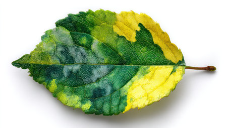 This image showcases a single leaf featuring a mix of green and yellow shades. The leaf displays a detailed texture with prominent veins, set against a plain white background. The composition highlights the organic form and vivid colors, which can be ideal for various design projects and editorial uses.