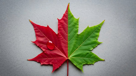 A macro photograph captures a single leaf in a moment of beautiful transformation. One half remains a vibrant, dewy green, while the other transitions into the warm tones of autumn, symbolizing the natural cycle of change, aging, and the passage of time on a clean white background.
