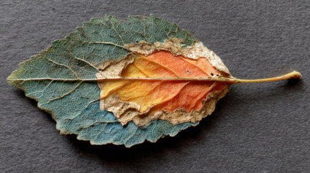A close-up captures a single leaf displaying a spectrum of autumn colors. The leaf, with its veins visible, lies on a rough, gray surface. The composition uses shallow depth of field, with soft lighting enhancing the textures. Suitable for illustrating natural beauty and seasonal themes in various applications.