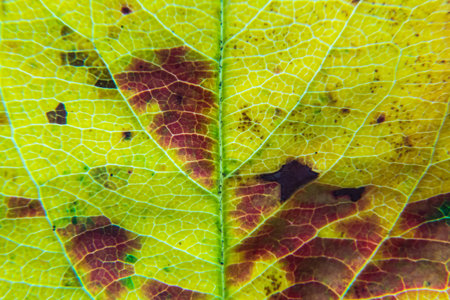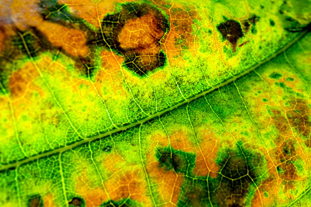 This macro photograph showcases a detailed view of a leaf, revealing intricate vein structures and various color gradients. The image displays a spectrum of colors, including green, yellow, and brown. The composition highlights the textures and patterns. Suitable for scientific illustrations, educational resources, and nature-themed content.