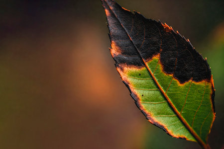 Half a green leaf with burnt black edges on a bokeh background